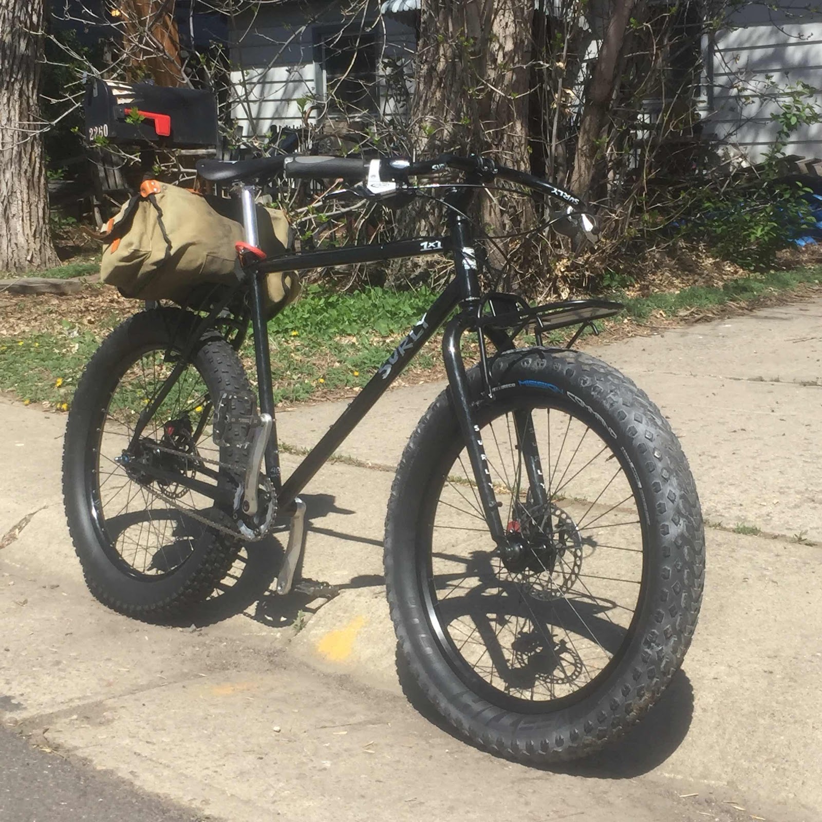 Here is the “final” (for now) configuration of the Surly 1x1. The tires are 24x4”, mounted on 25mm wide rims. Unfortunately, the fork would not clear the front tire, so I had to reinstall the 100mm spaced Pugsley fork. I really prefer the look of the shorter, curved, legs of the Origin8 fork, but sometimes you just have to go with what works.